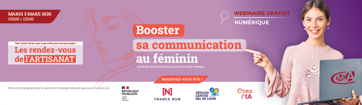 La Chambre de Métiers et de l'Artisanat Centre-Val de Loire vous propose à l'occasion de la journée des droits des femmes un webinaire inédit & entrepreneurial pour les femmes chefs d'entreprises souhaitant se démarquer et communiquer lors de cette journée 100 % féminine.