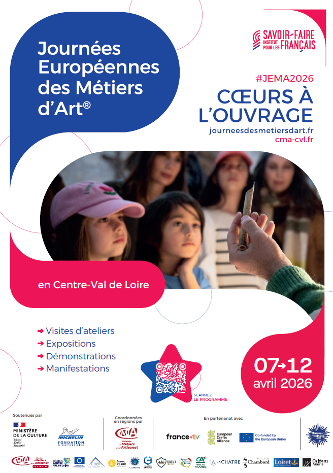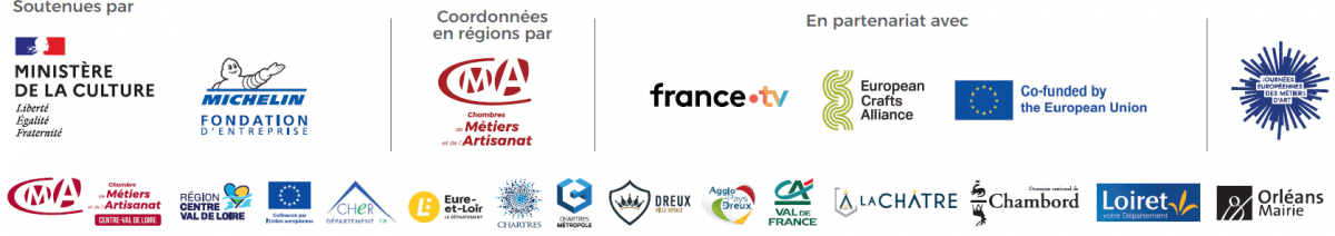 L’Institut pour les Savoir-Faire Français (ancien INMA) pilote et coordonne les Journées Européennes des Métiers d’Art®. En région Centre-Val de Loire, il s’appuie sur la Chambre de Métiers et de l’Artisanat Centre-Val de Loire avec le soutien de l’Union Européenne (FEDER) et de partenaires territoriaux.